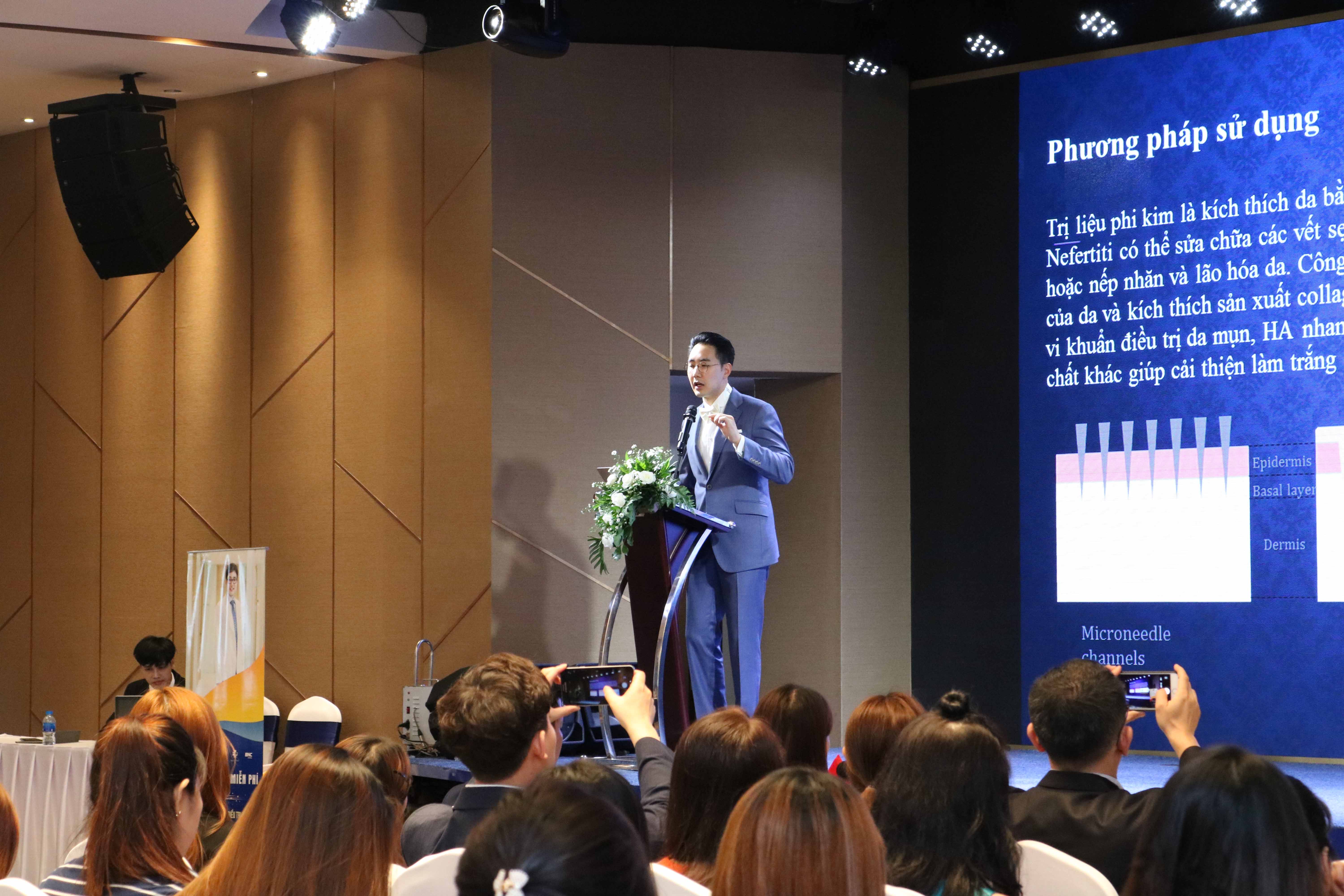Dưới sự dẫn dắt chi tiết và tận tâm cùng những dẫn chứng sinh động, BS.Kim Young Gwon đã mang tới những kiến thức rất bổ ích về phương pháp điều trị sẹo rỗ hiệu quả, an toàn theo tiêu chuẩn quốc tế. Không chỉ vậy, các bác sĩ Hàn Quốc và Việt Nam còn trực tiếp tiến hành demo điều trị để các đơn vụ tham gia có thể nắm vững từng thao tác điều trị và đảm bảo hiệu quả cao nhất cho khách hàng.