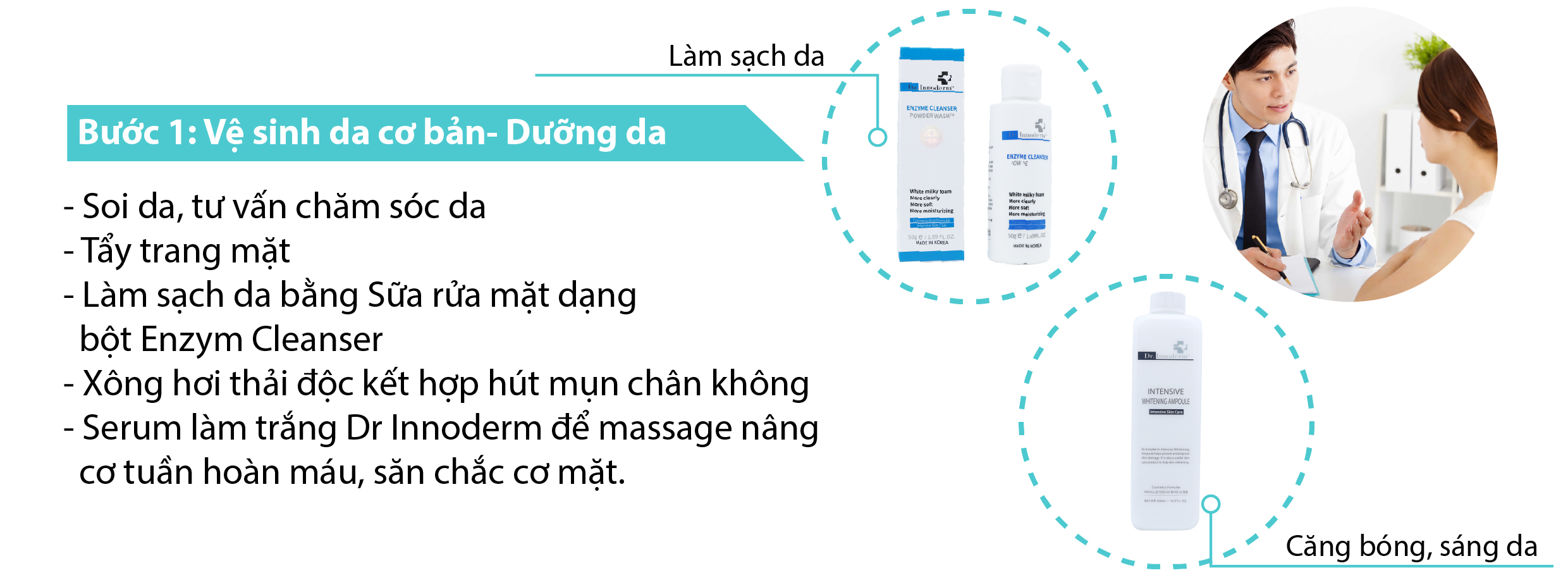Bước xông hơi thải độc kết hợp hút mụn chân không giúp làn da mịn màng và thông thoáng dễ dàng hơn cho việc thực hiện các bước tiếp theo. Thoa serum làm trắng Dr Innoderm để massage nâng cơ tuần hoàn máu, săn chắc cơ mặt và dưỡng chất này sẽ làm cho các bước sau trở nên hiệu quả hơn, gọi tắt là bước tiền lăn kim hay tiền phi kim.