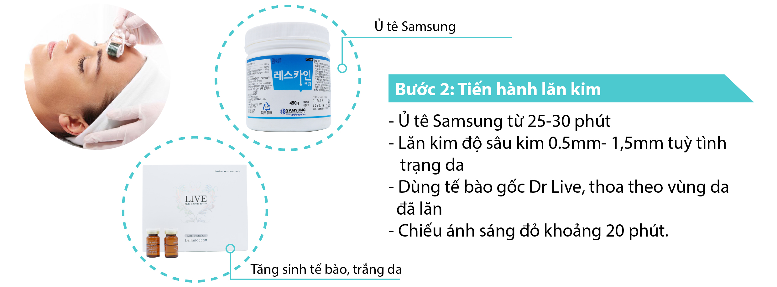 Tiến hành lăn kim với độ sâu kim 0.5mm- 1,5mm tuỳ tình trạng da đã thăm khám trước đó. Kết hợp việc lăn kim và thoa tế bào gốc giúp cho việc phục hồi và tái tạo da được tốt hơn. Nên dùng tế bào gốc Dr Live có tác dụng dưỡng da vượt trội, phục hồi tế bào da tổn thương sau lăn kim. Đây là sản phẩm tái tạo làn da bằng những dưỡng chất tự nhiên giúp lấy lại vẻ đẹp vốn có của làn da.