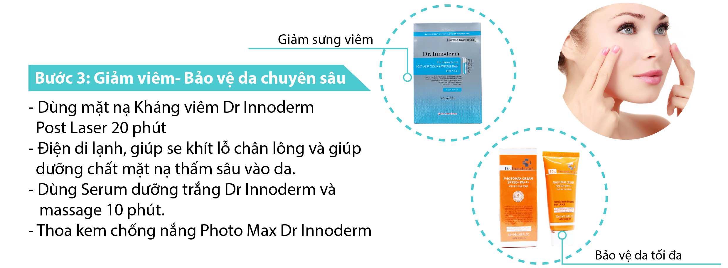 Trên đây, là 3 bước giúp cho việc điều trị những làn da tổn thương và nhiều khuyết điểm đã thành công trên thị trường Hàn Quốc nói riêng và thị trường Châu Á nói chung. Spa và thẩm mỹ viện có thắc mắc vui lòng liên hệ đến đội ngũ tư vấn chuyên sâu của Dr Innoderm nhé!