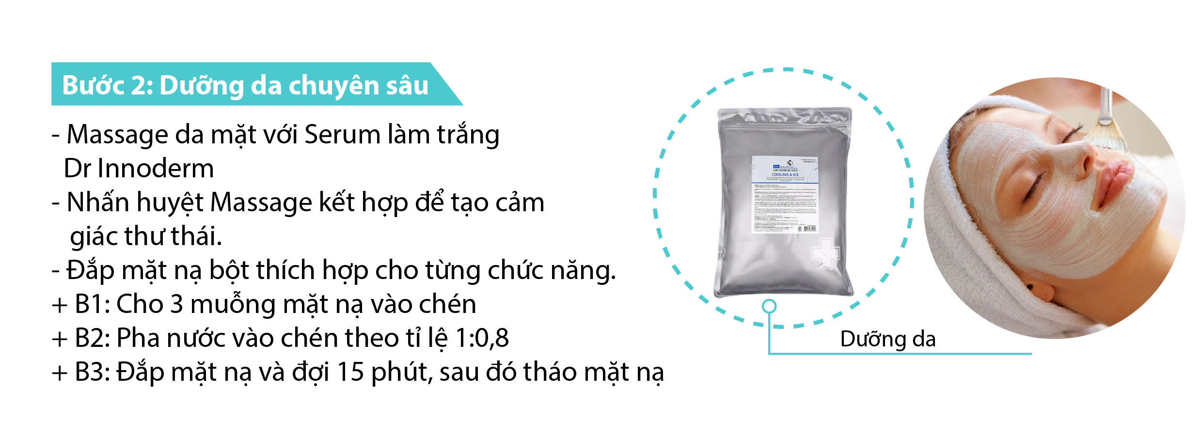 Massage da mặt với Serum làm trắng Dr Innoderm kết hợp với nhấn huyệt để tạo cảm giác thư giản, thoải mái và giúp nâng tông da. Tiếp theo là bước đắp mặt nạ chuyên dụng dưỡng da tùy vào nhược điểm của từng loại da để chọn mặt nạ phù hợp như: Vitamin C, than hoạt tính, Cooling&Ice,Collagen…