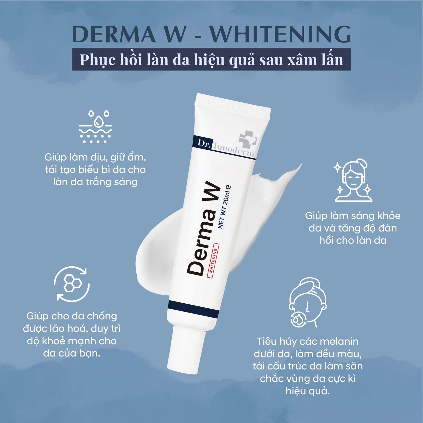 Kem làm trắng trị nám Derma W Dr.Innoderm giúp làm sáng da hiệu quả, đặc biệt là những vùng da bị nám, tàn nhang và các vết thâm do mụn hay các liệu trình thẩm mỹ. Thành phần đặc biệt giúp làm giảm sự xuất hiện của nám, tàn nhang sau thời gian ngắn sử dụng. Kem hỗ trợ điều trị cho làn da đang phục hồi sau bắn laser, loại bỏ melanin dư thừa dưới da, làm đều màu và giảm thâm. Đồng thời, sản phẩm giữ ẩm và tái tạo biểu bì da, mang lại làn da căng mịn và tươi sáng.