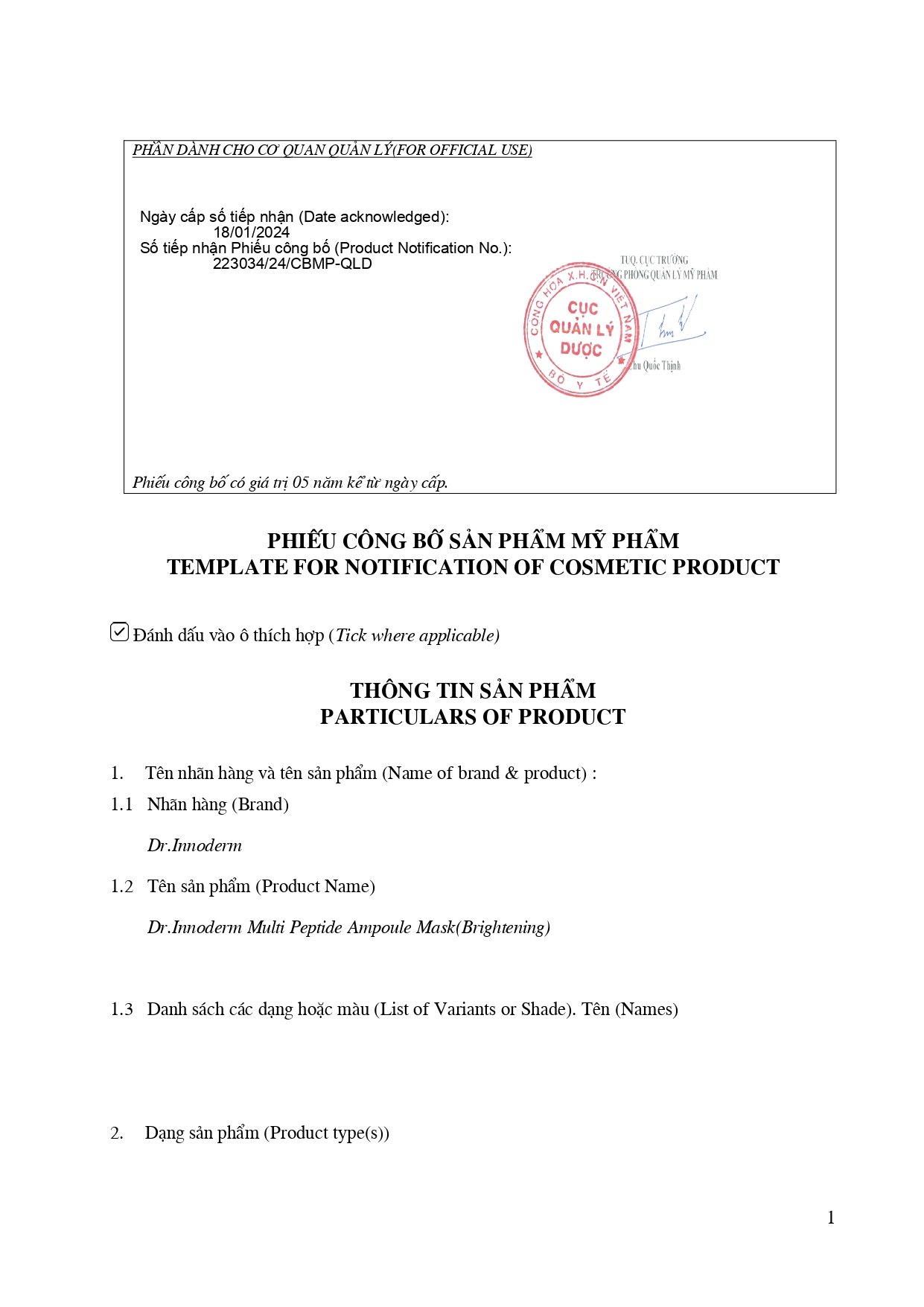 MẶT NẠ DƯỠNG TRẮNG DA DR.INNODERM MULTI PEPTIDE AMPOULE MASK (BRIGHTENING)