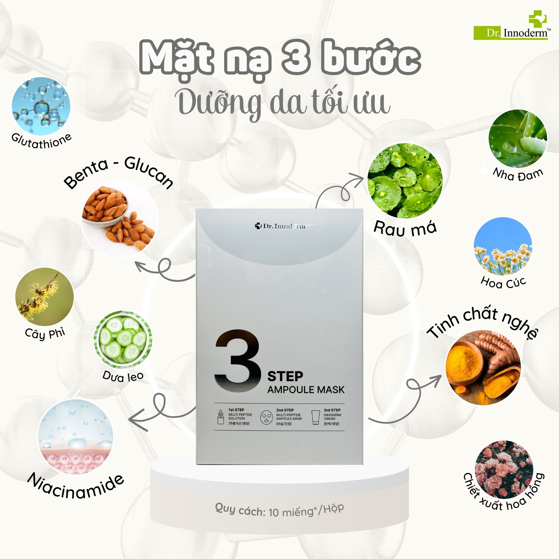 Khác mới mặt nạ thông thường chỉ có một loại tinh chất, mặt nạ dưỡng da 3 bước – 3 Step Ampoule Mask tích hợp cả 3 bước trong chu trình dưỡng da. Chứa các dưỡng chất nuôi dưỡng cho da, sản phẩm giúp làm giảm các vết thâm mụn, giảm viêm sưng đỏ sau các liệu trình xâm lấn, tái tạo da yếu, phục hồi da sau tổn thương, thu nhỏ lỗ chân lông, kiểm soát nhờn, căng bóng và giữ ẩm.